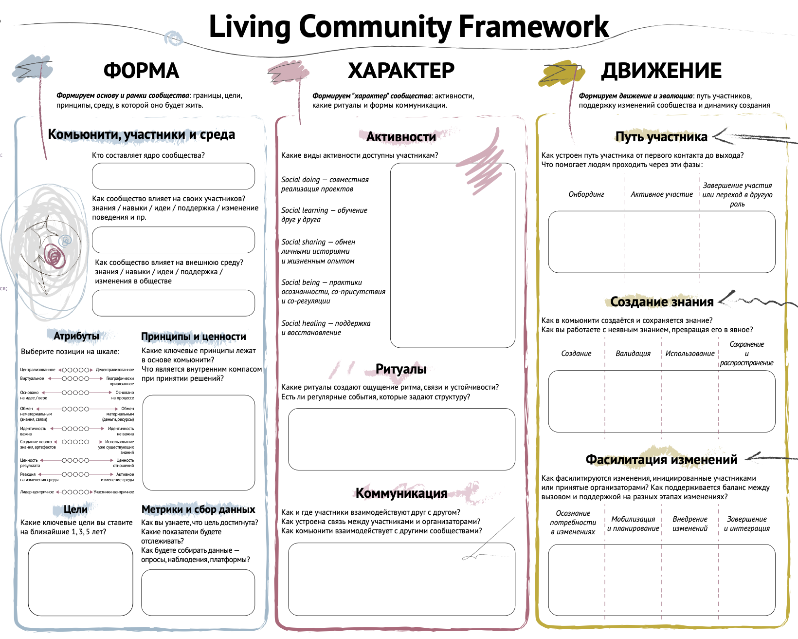 | | | КОМЬЮНИТИЛюди объединяются в сообщества столько, сколько существует человечество. Для меня комьюнити — это не просто группа, собранная вокруг продукта или бизнеса, а живая система с более широкими целями, в которой меняются люди и (или) среда вокруг. Я работала с разными фреймами (community canvas, community weaving framework), но в них мне не хватало развития этой системы. Поэтому я сделала свой бесплатный фрейм для проектирования комьюнити. 📥 Скачать в хорошем качестве и на разных языках можно здесь. Там же есть запись встречи, где я рассказываю, как им пользоваться.Во фрейме три части: - Форма: в какой среде живёт комьюнити, кто его участники, какие цели и принципы.